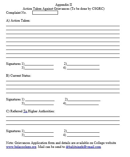 It is good to air a grievance rather than to keep it bottled up. Protection of human rights is essential for all round development of an individual’s personality. To realize the primary needs of the students and staff and secure civil liberties for everybody, a Grievance Redressal Cell already working in college since 2nd August, 2010. According to Guide lines of Government, a CSGRC has been constituted. The CSGRC is indented to find solutions for problems like Sexual harassment – any kind of physical or mental harassment, Complaints regarding class room teaching – Class room management, completion of syllabus, teaching methods etc, if and when they arise. The CSGRC convenes meetings periodically and takes steps to redress the grievance. The function of the cell is to look into the complaints lodged by any student of college and judge its merit. The Grievance Cell is also empowered to look into matters of harassment. Anyone with a genuine grievance may approach the department members in person, or in consultation with the officer in-charge Students' Grievance Cell. In case the person is unwilling to appear in self, grievances may be dropped in writing at the letterbox/ suggestion box. Grievances may also be sent through e-mail to the member/officer in-charge of Students' Grievance Cell.